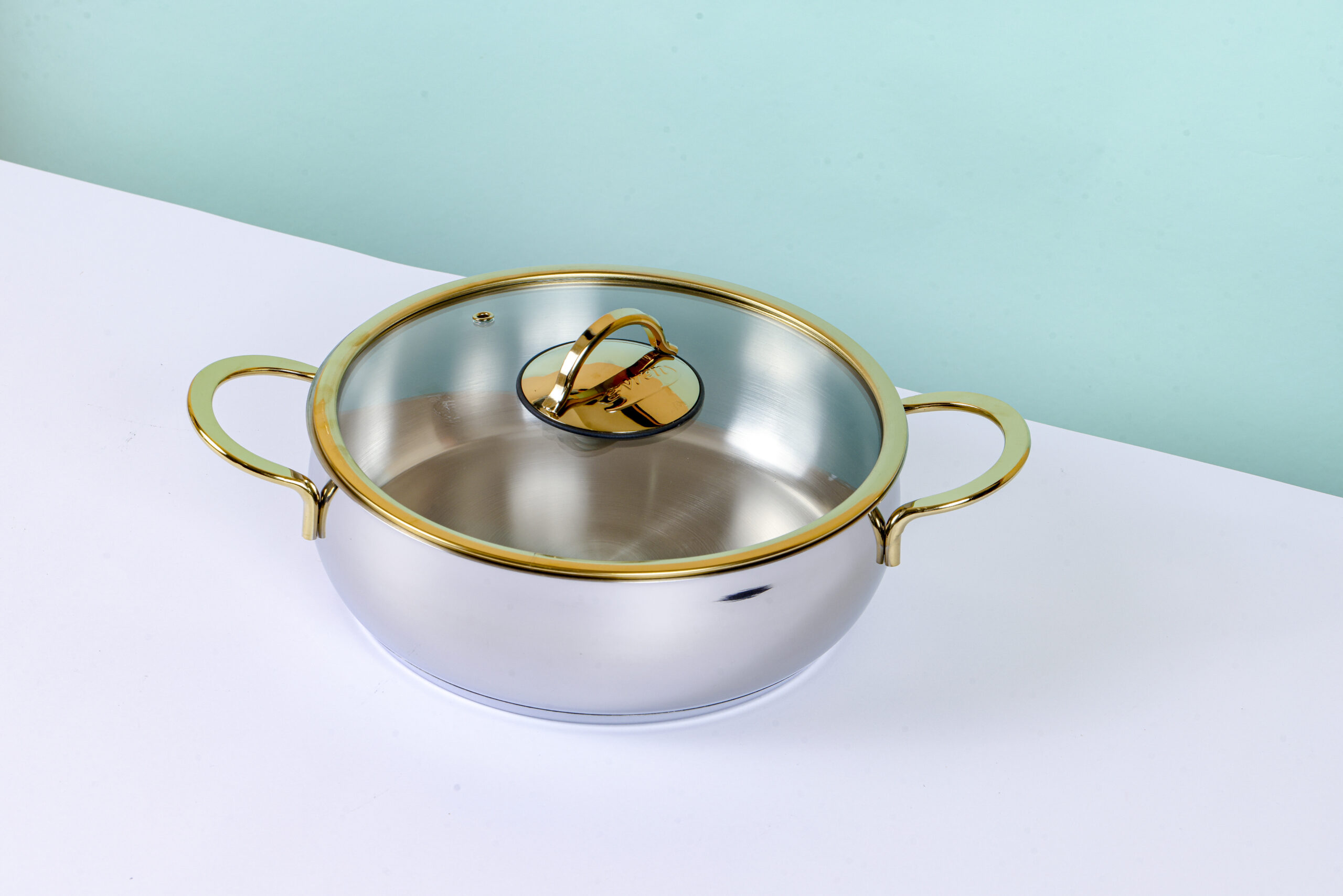 مصنوع من ستانلس ستيل عالي الجودة 18/10، بقاعدة سميكة لتوزيع مثالي للحرارة. مزوّد بمقابض ستيل متينة وغطاء زجاجي عملي لمتابعة الطهي بكل سهولة. خيار صحي، عملي، ويدوم لسنوات في مطبخك. 🍲🤍